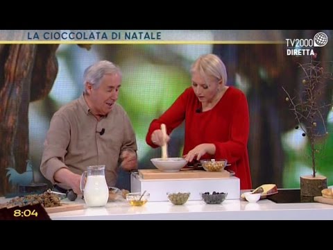 Augusto Tocci spiega a Lucia Ascione come preparare la cioccolata del bosco, con le nocciole e la farina di carrube.