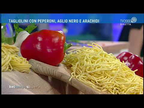Lo chef Sergio Maria Teutonico, ospite di Lucia Ascione a Bel tempo si spera, prepara i tagliolini con peperoni, aglio nero e arachidi