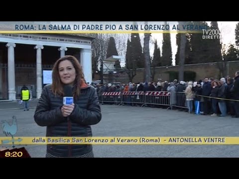 Dall’esterno della Basilica di San Lorenzo al Verano, Antonella Ventre mostra la fila dei fedeli in attesa di poter vedere la salma di Padre Pio.
