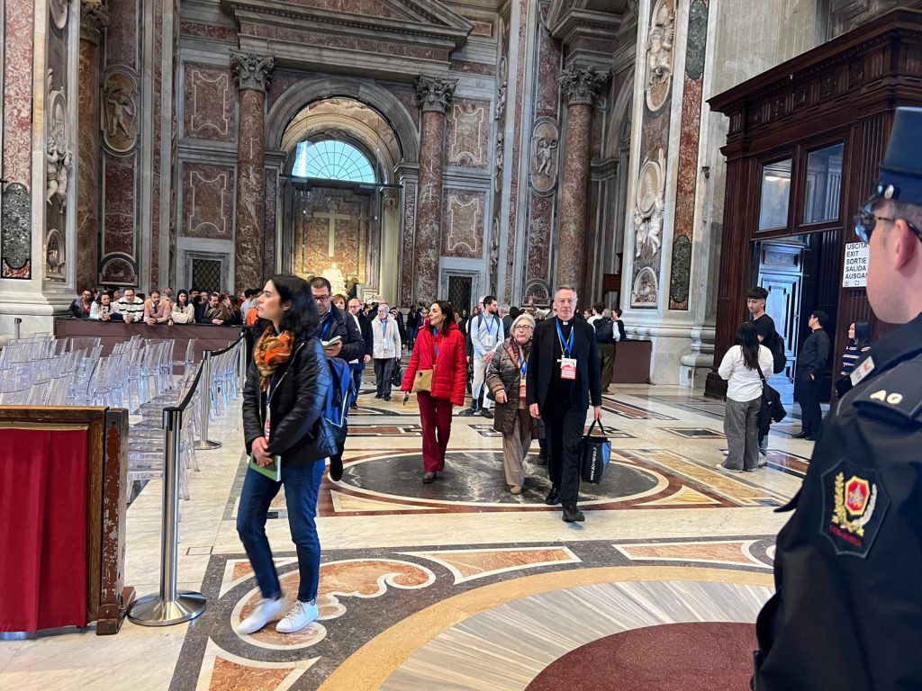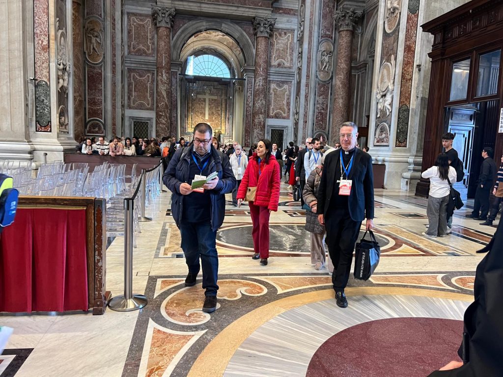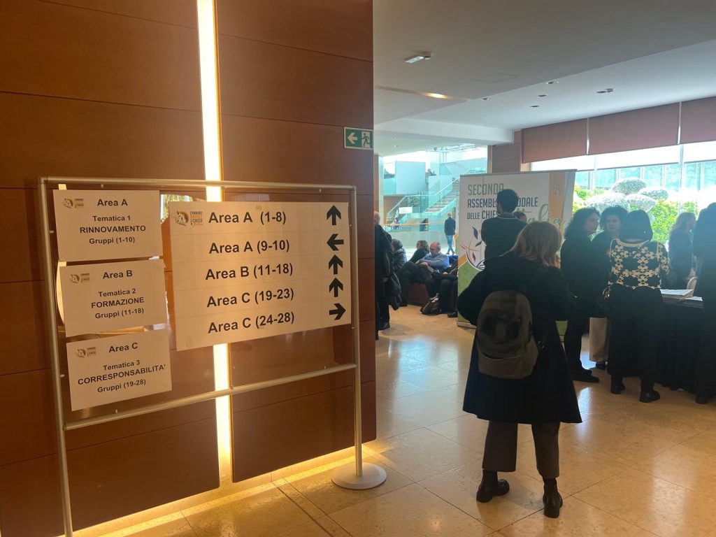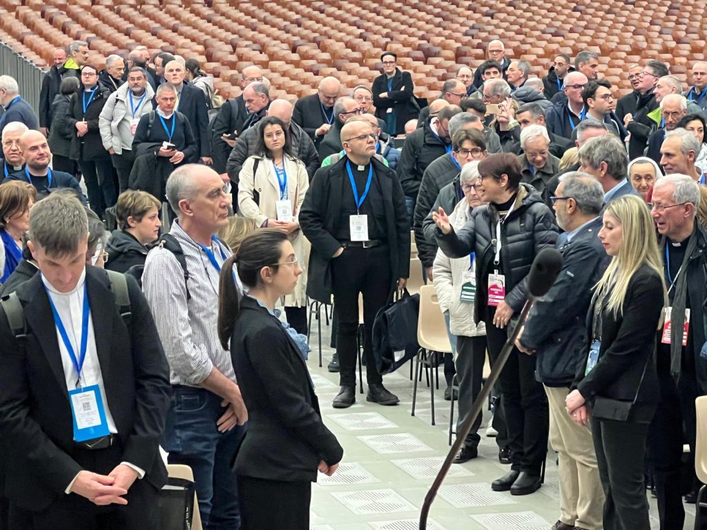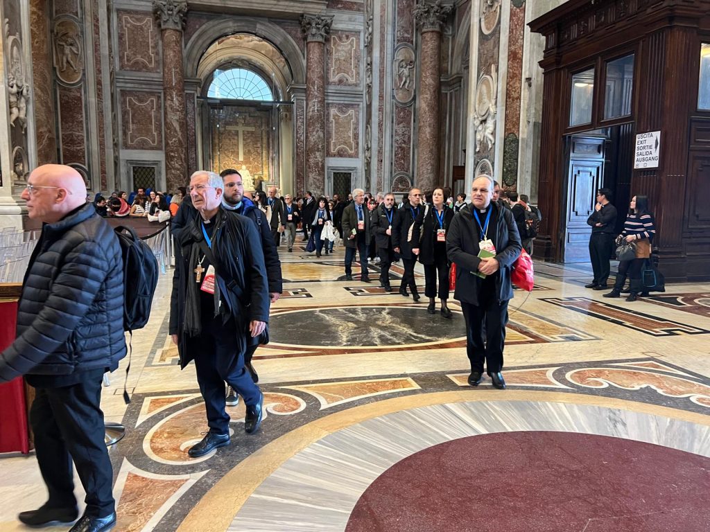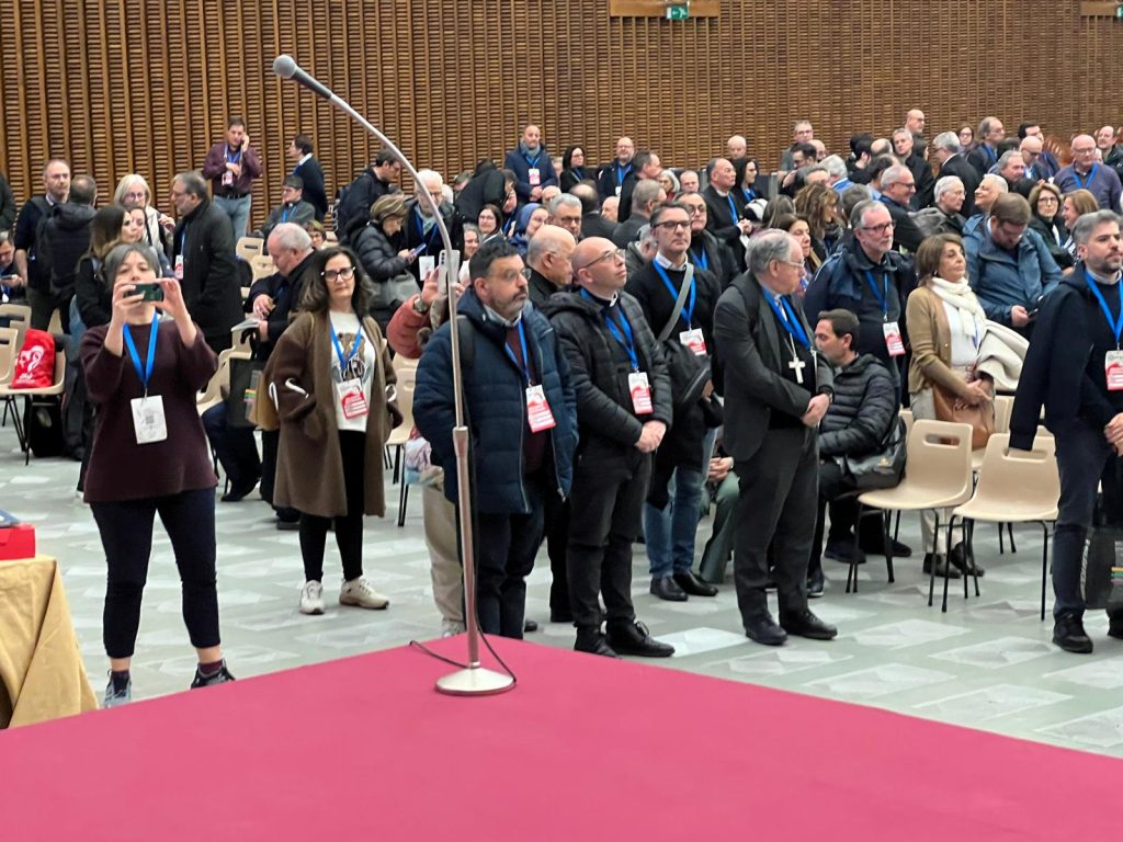 Terzo giorno di lavori della Seconda Assemblea sinodale delle Chiese in Italia nell’Aula Paolo VI in Vaticano. Sono 1008 partecipanti, di cui: 168 Vescovi, 7 Cardinali, 252 sacerdoti, 34 religiosi, 17 diaconi, 530 laici (di cui 253 uomini e 277 donne). Nella mattinata i partecipanti hanno proseguito il confronto nei gruppi di lavoro e nel pomeriggio si sono ritrovati nell’ Aula Paolo VI per un momento di riflessione con le testimonianze di don Claudio Burgio, cappellano dell’Istituto penale minorile Beccaria di Milano, Laura Lucchin, la mamma di Sammy Basso, e Giorgio e Marta Scarpioni, una famiglia che ha vissuto un’esperienza missionaria. E a seguire il Pellegrinaggio Giubilare verso la Basilica di San Pietro e il passaggio della Porta Santa.