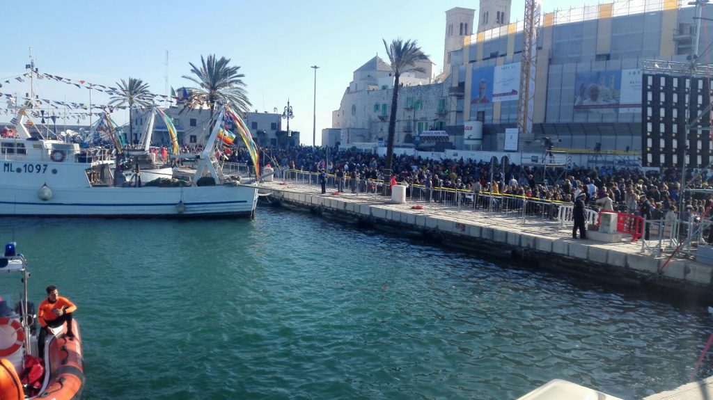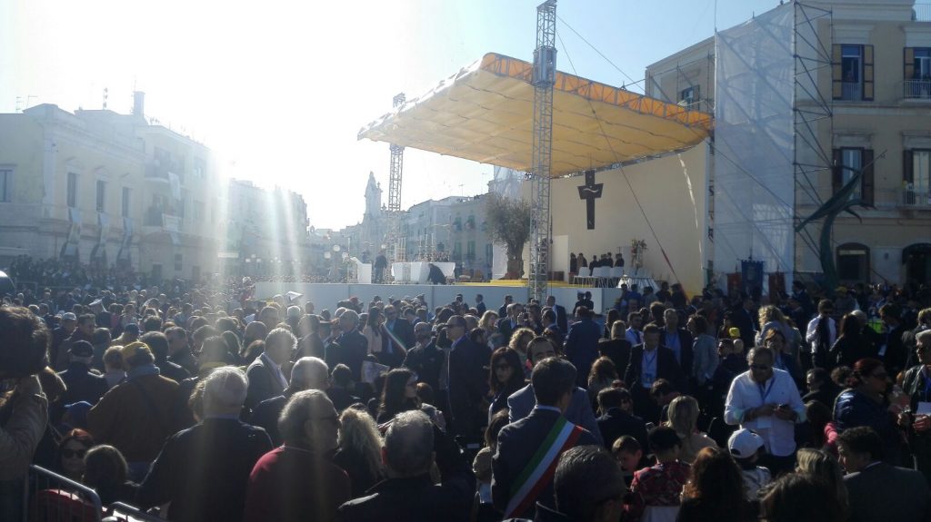 Nel Porto di Molfetta, Papa Francesco ha poi concelebrato la messa, e nell’omelia si è soffermato sul significato del Pane e della Parola. Ha ricordato le parole di Don Tonino durante gli esercizi spirituali ai sacerdoti malati e anziani, predicati nel 1991, a Lourdes: «Non bastano le opere di carità, se manca la carità delle opere. Se manca l’amore da cui partono le opere, se manca la sorgente, se manca il punto di partenza che è l’Eucaristia, ogni impegno pastorale risulta solo una girandola di cose».