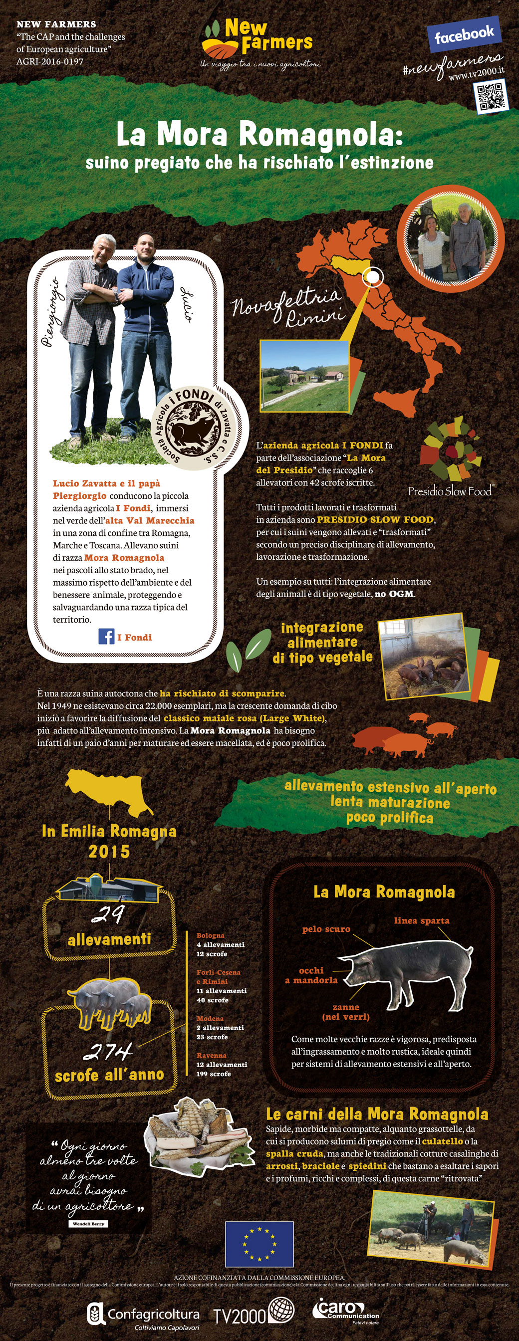 Parte dalle zone più montuose dell’Emilia Romagna il viaggio in dieci puntate di New Farmers. Prima tappa Novafeltria, provincia di Rimini, una zona di confine tra Marche, Romagna e Toscana, un’ alta espressione dell’Italia Centrale dove le condizioni climatiche e il paesaggio non sono adatti per l’agricoltura ma perfetti per il pascolo e l’allevamento. Qui ne capiremo di più su bovini e suini di pregio e scopriremo come si possono allevare gli animali e produrre carni di ottima qualità in modo sostenibile. Andremo a conoscere 2 famiglie di allevatori che hanno saputo coniugare l’antica tradizione agropastorale da cui provengono con la modernità. Conosceremo meglio le 3 razze IGP del Vitellone bianco dell’Appennino Centrale: la Romagnola, la Marchigiana, la Chianina e finiremo con la curiosa Mora Romagnola, una razza molto pregiata di suino scuro che ha rischiato l’estinzione. Tra gli ospiti della puntata anche uno chef del territorio che darà consigli per preparare e scegliere al meglio queste carni succulente.