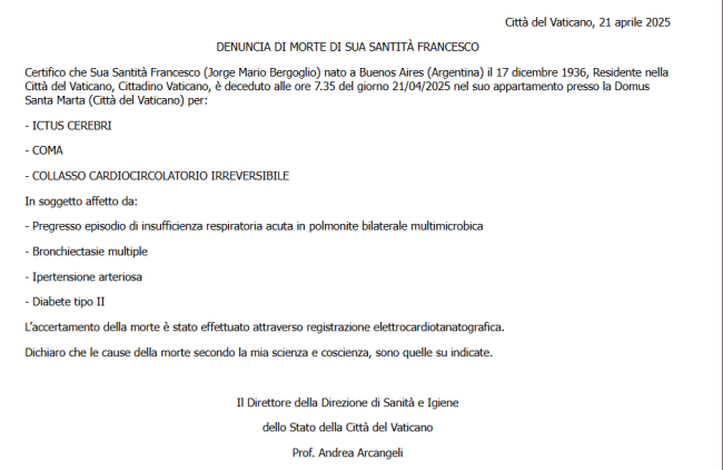 Il Papa è morto di ictus e collasso cardiocircolatorio