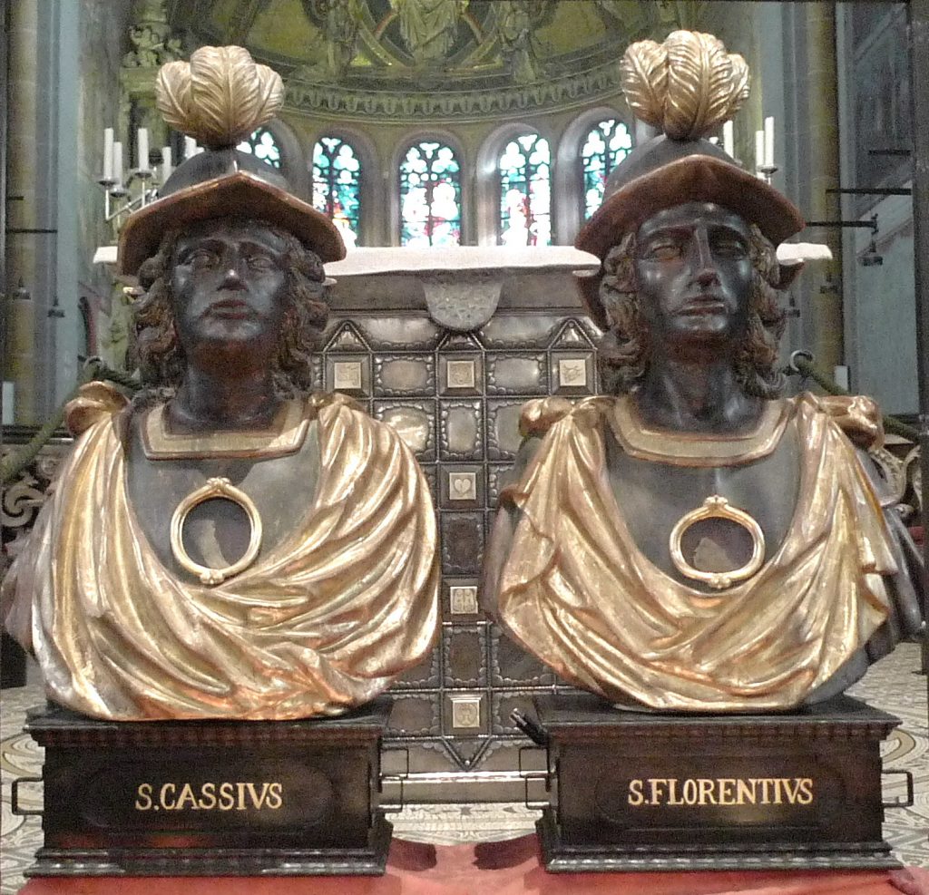 I santi Cassio e Fiorenzo ed i loro compagni sono ritenuti dei soldati della Legione Tebea scampati all’eccidio di Agauno (odierna Saint-Maurice in Svizzera), ma non come tali sono ricordati dal nuovo Martyrologium Romanum. Raggiunsero la città tedesca di Bonn, ove si dedicarono all’evangelizzazione delle popolazioni locali. Furono quindi anch’essi decapitati in odio alla fede cristiana.