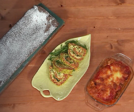 Mattonella di carote e caprino, riso con spezzatino, pizza quattro formaggi