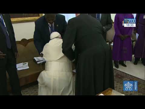 A Casa Santa Marta Papa Francesco bacia i piedi ai leader del Sud Sudan: “Vi chiedo come fratello: rimanete nella pace. Lo chiedo con il cuore, andiamo avanti, ci saranno tanti problemi ma non spaventatevi. Risolvete i problemi. Avviate un processo che finisca bene.