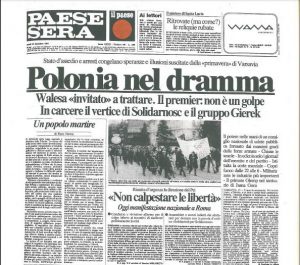 La situazione in Polonia venne seguita da tutti i giornali e le televisioni occidentali. Nella foto la prima pagina di Paese Sera, quotidiano del pomeriggio, che dedicò numerosi approfondimenti alla questione.