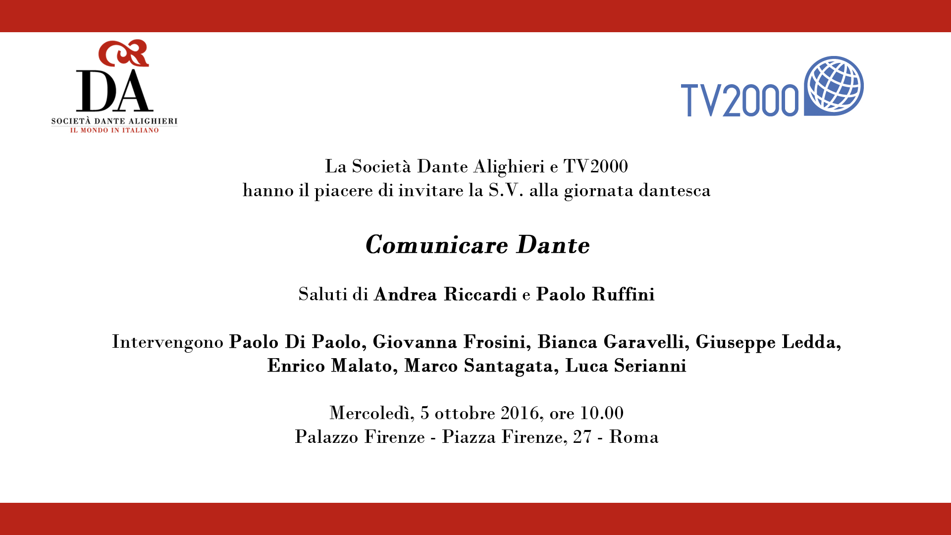 Mercoledì 5 ottobre, alle 10.00, nella cornice del chiostro di Palazzo Firenze, sede centrale della “Società Dante Alighieri”, ci saranno: Luca Serianni (Università “La Sapienza” di Roma), Enrico Malato (Università “Federico II” di Napoli), Giovanna Frosini (Università per gli Stranieri di Siena), Giuseppe Ledda (Università “Alma Mater Studiorum” di Bologna), Marco Santagata (Università di Pisa) e Mirko Tavoni (Università di Pisa). A introdurre le relazioni saranno Paolo Ruffini, direttore di Tv2000, e Andrea Riccardi, presidente della “Società Dante Alighieri”, con la moderazione della giornalista di Tv2000 Monica Mondo.