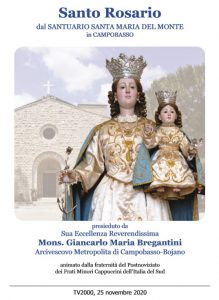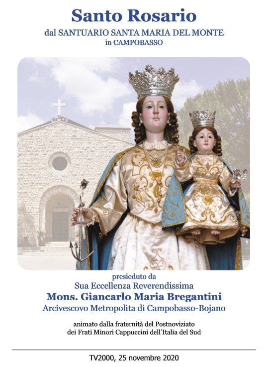 Roma, 24 novembre 2020. ‘Prega con noi’ Tv2000 e InBlu Radio invitano i fedeli, le famiglie e le comunità religiose a ritrovarsi, mercoledì 25 novembre, alle 21, per recitare insieme il Rosario che verrà trasmesso da Tv2000 (canale 28 e 157 Sky), InBlu Radio, e su Facebook. La preghiera sarà trasmessa dal Santuario Santa Maria del Monte di Campobasso, con mons. Giancarlo Maria Bregantini, Arcivescovo di Campobasso- Boiano.