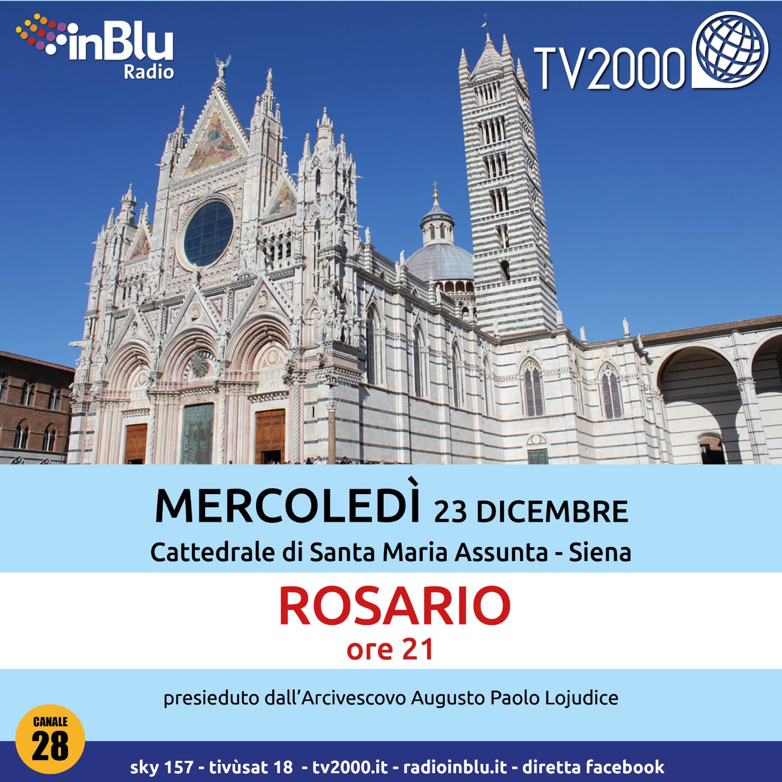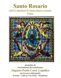 Roma, 22 dicembre 2020. ‘Prega con noi’ Tv2000 e InBlu Radio invitano i fedeli, le famiglie e le comunità religiose a ritrovarsi, mercoledì 23 dicembre alle 21, per recitare insieme il Rosario che verrà trasmesso da Tv2000 (canale 28 e 157 Sky), InBlu Radio, e su Facebook. La preghiera sarà trasmessa dalla Cattedrale di Santa Maria Assunta di Siena, con il cardinale Augusto Paolo Lojudice, arcivescovo di Siena-Colle di Val d’Elsa-Montalcino.