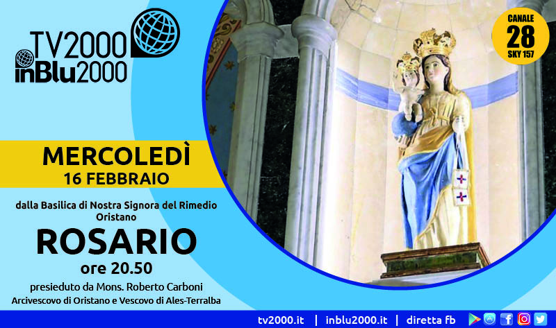 Roma, 14 febbraio 2022. ‘Prega con noi’ Tv2000 e InBlu2000 invitano i fedeli, le famiglie e le comunità religiose a ritrovarsi, mercoledì 16 febbraio alle 20.50, per recitare insieme il Rosario trasmesso su Tv2000 (canale 28 e 157 Sky), InBlu2000, e su Facebook. La preghiera sarà trasmessa dalla Basilica di Nostra Signora del Rimedio a Oristano, con mons. Roberto Carboni, Arcivescovo di Oristano e Vescovo di Ales-Terralba.