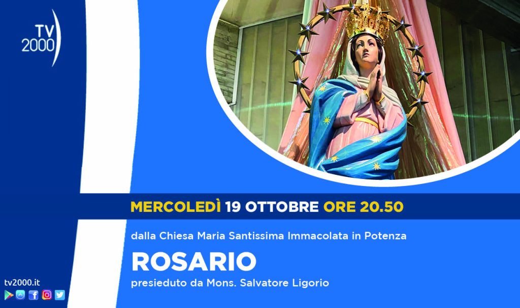 ‘Prega con noi’, Tv2000 invita i fedeli, le famiglie e le comunità religiose a ritrovarsi, mercoledì 19 ottobre alle 20.50, per recitare insieme il Rosario. La preghiera sarà trasmessa dalla Chiesa Maria Santissima Immacolata a Potenza, con mons. Salvatore Ligorio, arcivescovo di Potenza-Muro Lucano-Marsico Nuovo.