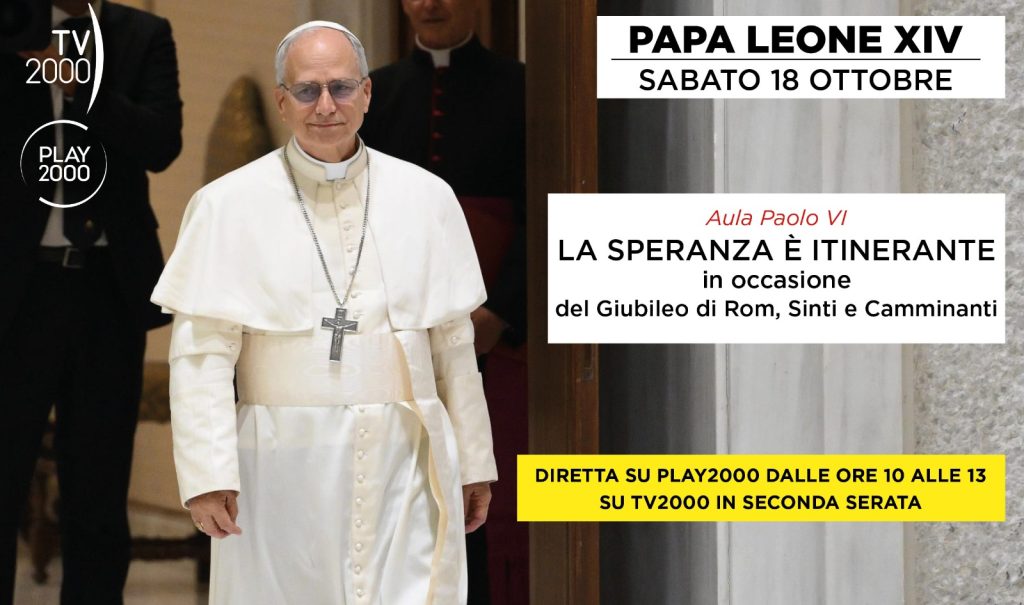 Su Play2000, l’App di Tv2000 e Radio inBlu2000, domani 18 ottobre dalle 10 alle 13, in diretta e on demand l’evento “La speranza è itinerante”, che si terrà nell’Aula Paolo VI in Vaticano alla presenza di Papa Leone XIV, nell’ambito del Giubileo dei Rom, Sinti e Camminanti, organizzato dal Dicastero per lo Sviluppo Umano Integrale in collaborazione con la Fondazione Migrantes (CEI), la Comunità di Sant’Egidio e il Vicariato della Diocesi di Roma. L’evento è visibile anche su Tv2000 in seconda serata.