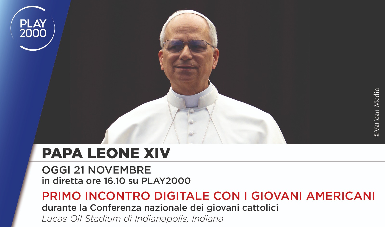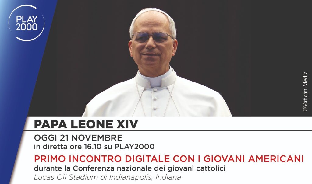 Su Play2000, piattaforma streaming di Tv2000 e Radio inBlu2000, in diretta oggi venerdì 21 novembre alle ore 16.10 il primo incontro digitale di Papa Leone XIV con i giovani americani durante la Conferenza nazionale dei giovani cattolici a Lucas Oil Stadium di Indianapolis, Indiana.