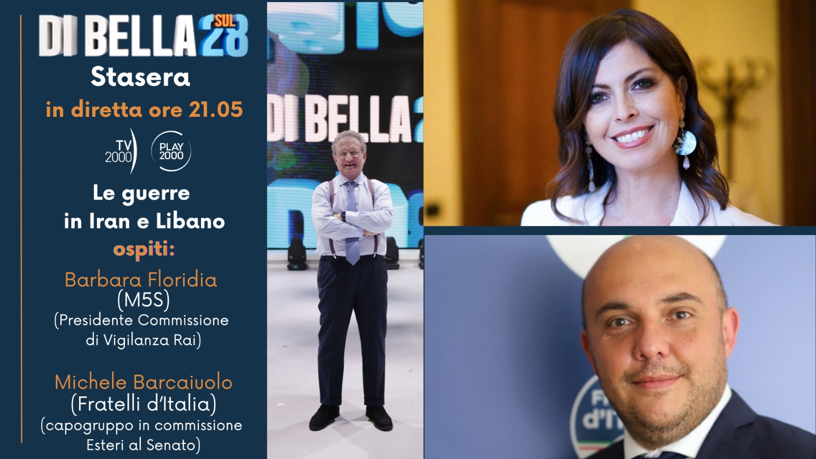 La presidente della Commissione di Vigilanza Rai, Barbara Floridia (M5S) e il capogruppo di Fratelli d’Italia in commissione Affari esteri e difesa al Senato, Michele Barcaiuolo. Sono gli ospiti della nuova puntata del programma ‘Di Bella sul 28’, condotto da Antonio Di Bella, in onda stasera in diretta su Tv2000 alle ore 21.05. Tra i temi della puntata: la guerra di Trump e Netanyahu contro l’Iran, quella di Israele contro Hezbollah in Libano, e il bilancio delle vittime che vede sempre più coinvolti i bambini. In studio anche Monica Mondo di Tv2000 e Livio Gigliuto dell’Istituto Piepoli.